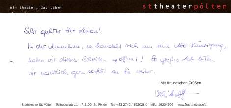 FOTO 2004. 13 Jahre nach meinem Ende meiner Schauspiel- und Intendantentätigkeit bekam ich diesen Brief. Leider war das Kuvert nicht dabei, da es ein Irrläufer war und durch das Stadttheater geöffnet wurde. Ein spätes, aber umso mehr erfreuliches Publikumslob. (Siehe unten.)