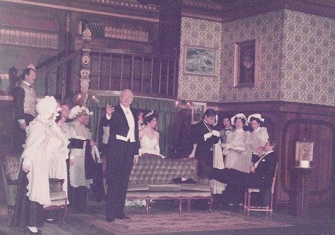 FOTO: 1986. Lady. Beginn II. Teil. "Sie sind der es geschafft hat, was keiner je geschafft hat, weil nicht einer diese Kraft hat, nur ein Genie wie Sie!" Von links: Diener und Stubenmädchen, ( Chor und Ballett), Herwig LENAU, Elfriede MOHRENBERGER, ?, Stubenmädchen und Diener, Erik Joey PFLÜGER.